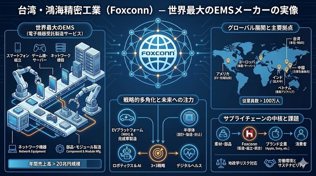 鴻海精密工業(Hon Hai Precision Industry Co., Ltd.、ブランド名:Foxconn)は、台湾に本社を置く世界最大級の**電子機器受託製造サービス(EMS)**企業です。